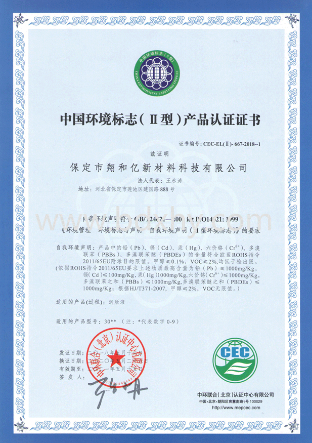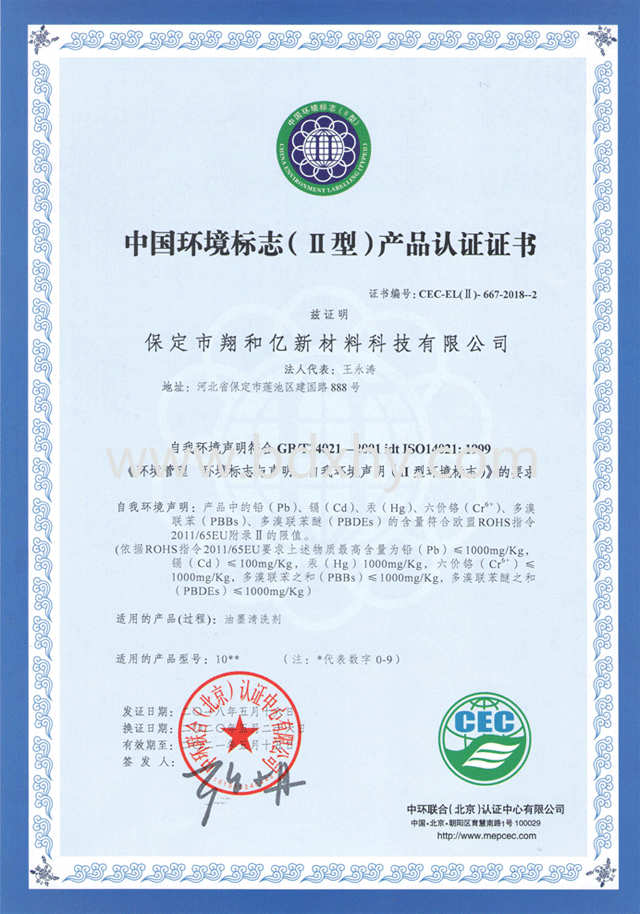 我公司于2018年5月通過(guò)中環(huán)聯(lián)合(北京)認(rèn)證中心對(duì)我公司嚴(yán)格審查,認(rèn)證通過(guò)并獲得《中國(guó)環(huán)境標(biāo)志(II型)產(chǎn)品認(rèn)證證書(shū)》—認(rèn)證產(chǎn)品名稱(chēng):潤(rùn)版液,油墨清洗劑。
